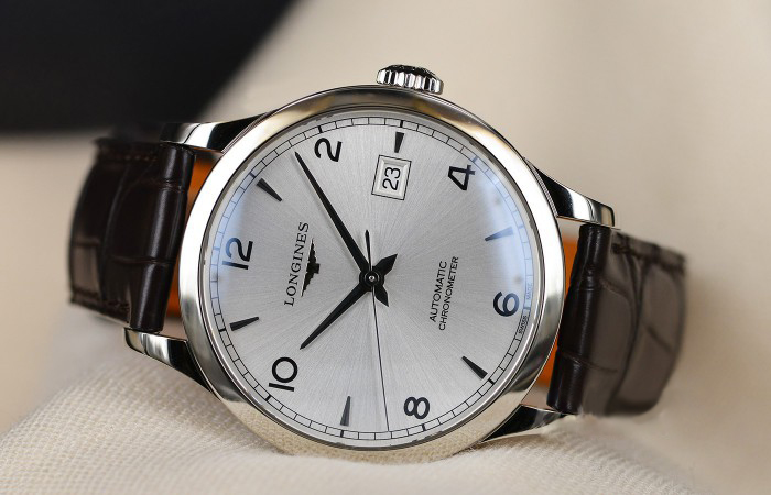 银白色日辉纹盘面,中央大三针与阿拉伯数字、三角立体时标以及外圈轨道盘相辉映,令盘面布局一目了然,时间指示清晰直观。3时标位置设有日历显示窗口,12时标下方,设有大写的浪琴英文标识以及经典的“沙漏飞翼”LOGO,赋予腕表简洁美感。