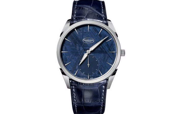 腕表点评:帕玛强尼1950系列腕表采用高抛光的钛金属表壳,直径39毫米,厚度7.8毫米的超薄表款。蓝色的钛金属的表盘用陨石修饰,呈现出陨石不规则花纹。小三针的表盘设计,三角形刻度时标和三角形的时针、分针,整体风格简单利落。6点钟位置的小秒盘为蓝色钛金属表盘,表盘其余位置皆用蓝色陨石表盘修饰。蓝色的爱马仕鳄鱼皮表带,与蓝色陨石表盘想匹配,散发着一种不可预测之美。搭载一枚PF 701自动上链机械机芯,机芯厚度仅为2.6毫米,其超薄的尺寸得益于位于机芯内的偏心铂金微型自动摆陀,机芯装饰出众十分出众。
