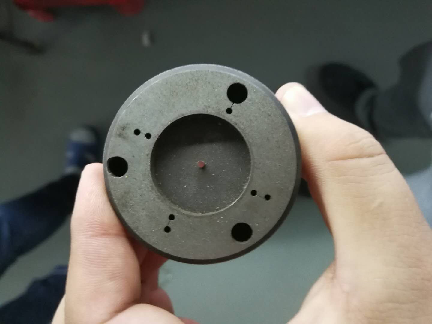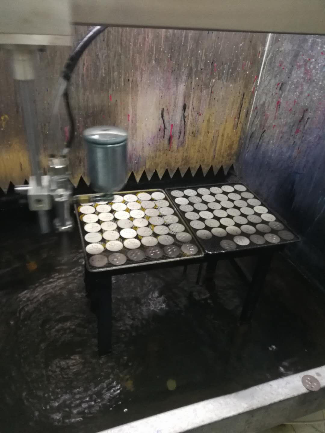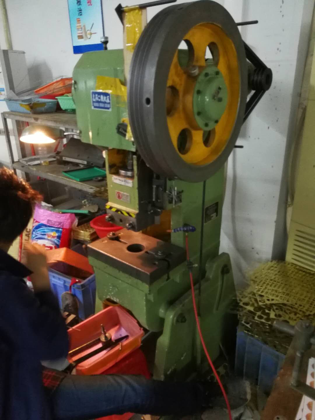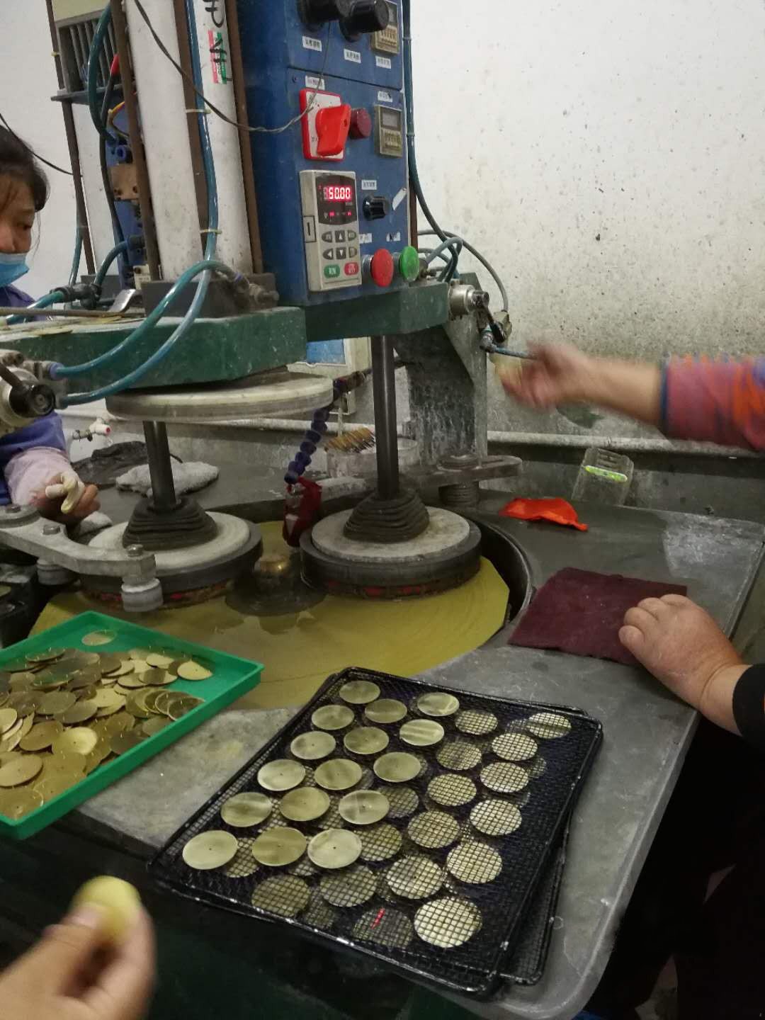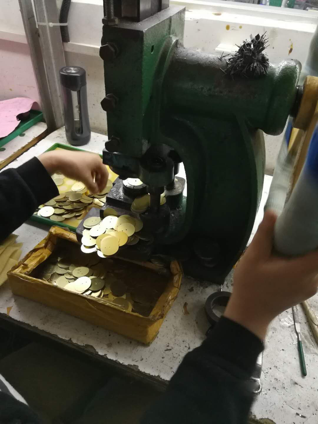 冲压好外形再冲孔,中孔、字钉孔和logo孔,打好孔要磨批锋倒角