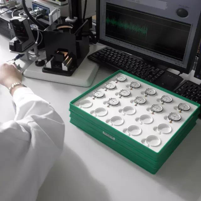准备拿去进行天文台认证的劳力士迪通拿4130机芯,注意有两个看点。第一,都换用了特制的专用表盘,方便仪器读取指针数据。第二,进行天文台认证的机芯是没有自动陀的,是为了追求等时性的公平。劳力士把机芯厂安置在比尔市,还有一个原因是,比尔乃COSC天文台认证的创始区,在当地就有认证机构。