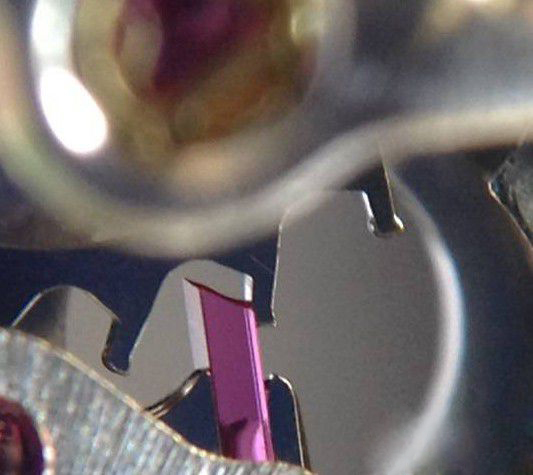 继续说功能性打磨的话,劳有很多。再找个典型,比如擒纵叉的镜面和倒角打磨。虽然劳没有像宝玑(阿伯拉罕·路易·宝玑是我最崇拜的大神)那般炫技,宝玑经常在擒纵叉上玩了镜面倒角又在上面玩微雕Logo,还得用10倍以上的寸镜使劲瞅。但劳也是实实在在做了可以说越级的打磨,毕竟这个玩法多在10万起步顶级梯队的腕表里才能见到。