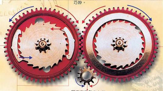 搞自动上链必然要提“红轮”,提红轮就得先搞懂其原理。红轮除了显著的红色特氟龙自润滑涂层,换向结构也很独特,是我个人认为的较完美的双向自动上链解决方案。每个红轮都是一个单向的棘轮结构,但是锁止动作没有弹簧的参与。全是靠双头“锁钩”的几何形状来完成“逆向锁止——传动”“顺向解锁——空转”的动作(注意下图中那些红蓝箭头)。自动陀无论怎么转,都可以通过三个齿轮的组合对发条实现最终上链方向始终如一的自动上链。而且由于结构合理没有弹簧的参与,摩擦微小,组件又十分粗壮,特别的耐用,传动效率也高。劳作为世界上第一支自动上链表,也算是做足了表率。