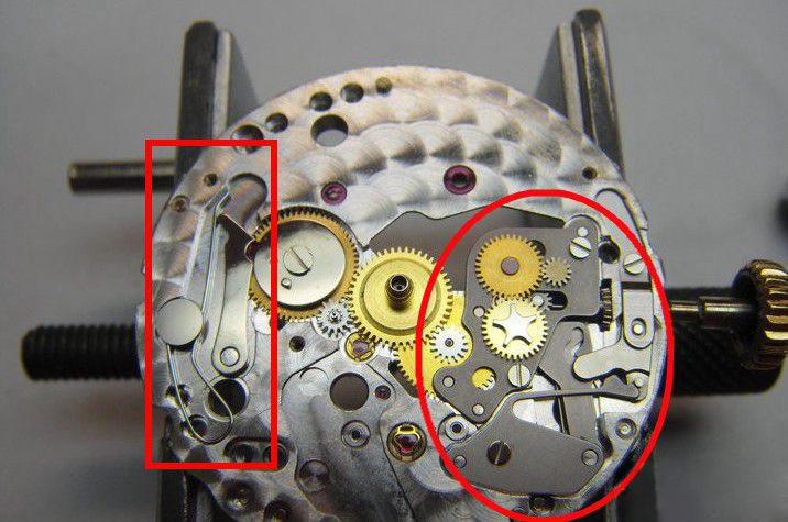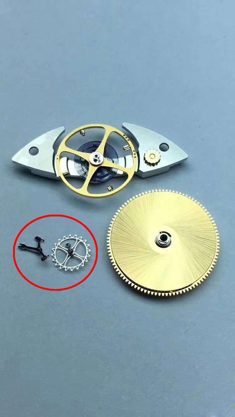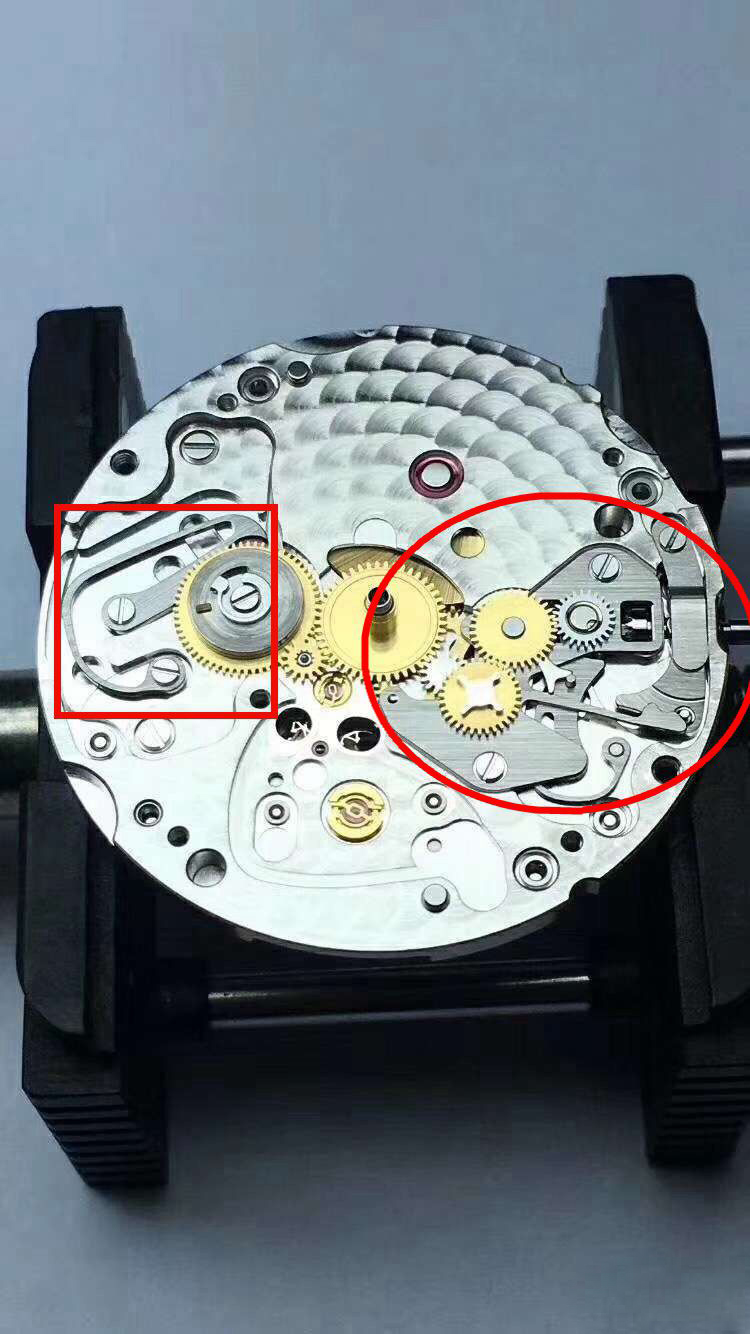 而红色方框中的瞬跳簧,也由钢丝弹簧换成了切割板簧,在这里钢丝弹簧的最大的劣势是,保养时不慎容易崩飞。尤其是我以前拆的机芯一些U形的钢丝簧,一飞老远,找起来要天荒地老。