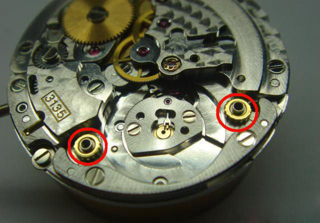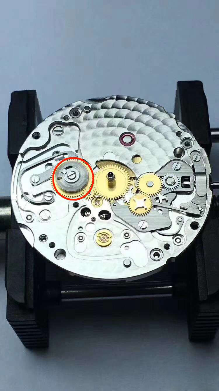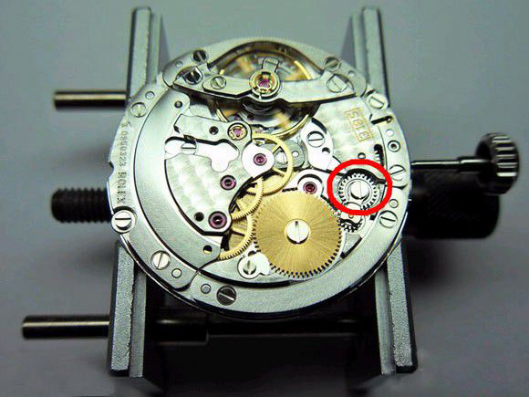 相应“加大增粗”的,还有负责为手动上链传动的小钢轮(下图一、图二红圈处)。个人猜测劳加大了小钢轮的直径,应该是为了减少上满发条的圈数,让70小时动储的上链圈数接近原来的3135。这也是尊重用户习惯注重用户体验的做法,一来不必浪费时间多去跟发条较劲,二来打开表把的时间越短越有利于密封防水。