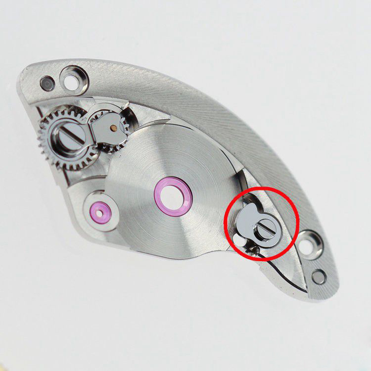 而且红色方框里的瞬跳板簧与瞬跳机构的摇臂做成了一体,这样无论拆还是装都是极大的方便,一个优美的弧线下来,也比原来3135的钢丝看上去刚劲有力,颇具美感。