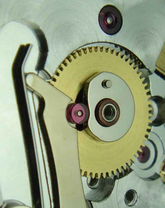究其原因,就在劳对瞬跳轮的原结构之上增加了一个小小的“板簧式拨杆”,这个弹性的拨杆可以柔性的化解避过快拨日历盘带来的动能,而不会像3135那样瞬跳轮是与日历盘硬连接,“爬坡凸轮”曲线积蓄的瞬间动能不会被释放掉。所以3235在快拨之后仍然能按原定的夜间零时跳历,而不会重新进行“日历爬坡”。这应该是我见到的最完善的单日历系统,劳不愧为当年世上第一支日历表的发明者。
