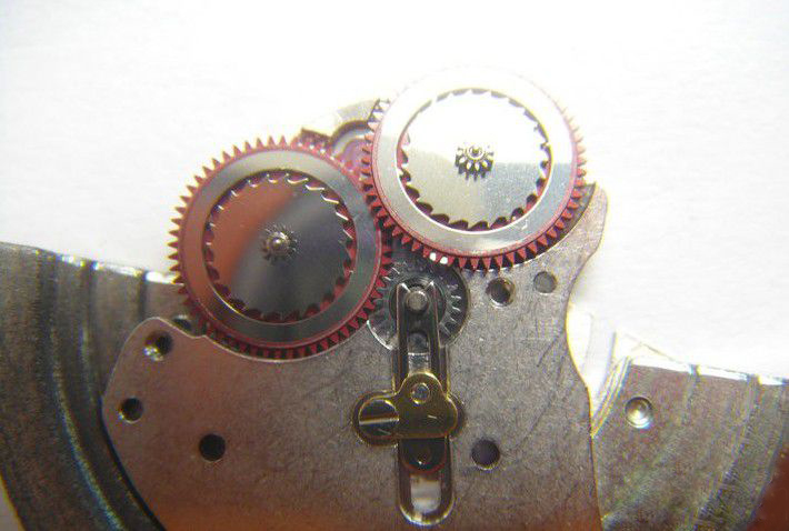 然鹅,下图改为内红轮的3235,已经不像3135红的发骚又红的深沉了,变成了闷骚,这点我表示很不爽。不过你发现没有,原来3135红轮的中央棘轮25个齿,比较密,但3235的齿数变疏,数了数是14个齿。显然是这更少的14个齿的决定,让单个的齿更为粗大刚猛,锁止片也相应变大,看这棘轮张牙舞爪的,劳是要整哪样?—— 考虑考虑70小时动储,就不难理解了,70小时的发条满链力矩那肯定大。。。劳加强一下红轮构件就不难理解了,其实原有的红轮强度也应该够用,不过劳一贯稳健的作风,还是弄了个粗壮的。我猜内红轮外面改铜轮也是考虑强度原因,特氟龙其实很软的,只不过自润滑效果好而已。红轮红色的特氟龙外表内还是有金属本体支撑,但是较为轻薄。估计劳怕旧有的红轮齿合部位达不到应付70小时动储强有力的发条该有的负荷强度,而舍弃了“观感”走了铜外红内的“红裤衩路线”。