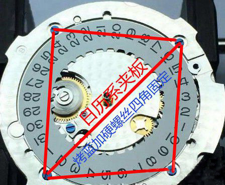 其实纵观3235整芯,所有夹板都呈现加大加固的趋势,而且螺钉也是能多加就多加,尽量呈现多个角对称都有螺钉坐镇,类似摆夹板的“跨桥结构”。这足以窥知劳还是不忘初心,向着更坚固、更稳定的方向使劲儿。没办法,劳就是喜欢玩刚猛耐操(下图三、图四)。这种设计真是务实又良心,而且在厚度方面控制的也并不离谱。看到这里我想起当年业余拆ETA2892的时候,猛吸一口气,那空间安排的,错落有致,叹为观止。当然,2892是为了薄而薄,在耐操方面其实还是不及同门的2824。