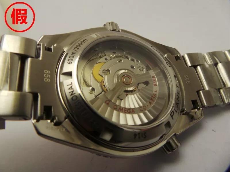 而第二代的假欧米茄自产同轴机芯的欺骗性就更更强了。假表厂家不仅将自动陀的款式改成了正版的样式,而且还做一个全覆盖的金属盖板,将其覆盖在ETA/海鸥/西铁城等机芯上。相当于一个人换上了整张的面具来伪装。