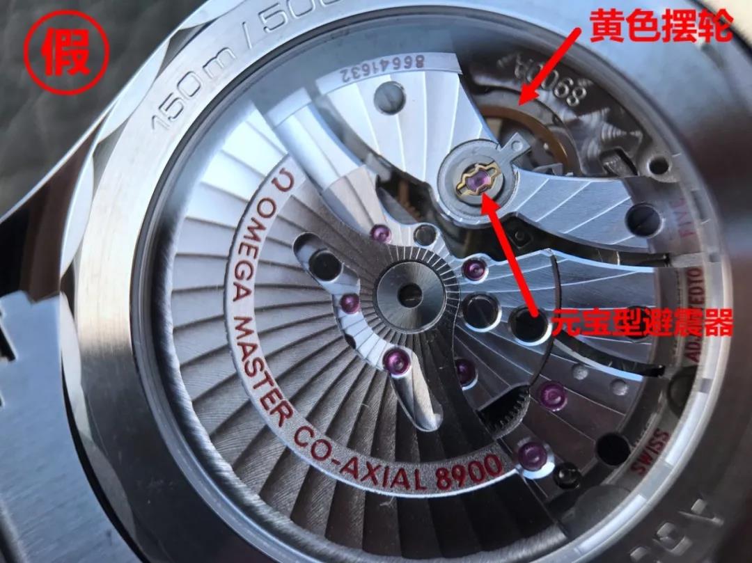 不过其覆盖的只是一层金属板,为了保证正常的走时,下面暗藏的还是ETA/海鸥/西铁城等机芯。而同轴机芯作为欧米茄品牌的自产机芯,自然拥有一些特殊的配置,难以被仿冒。比如,欧米茄自产同轴机芯的避震器是Nivachoc,造型为两个对立的字母“T”。同时欧米茄自产同轴机芯的摆轮不是常见的黄色,而是黑色。
