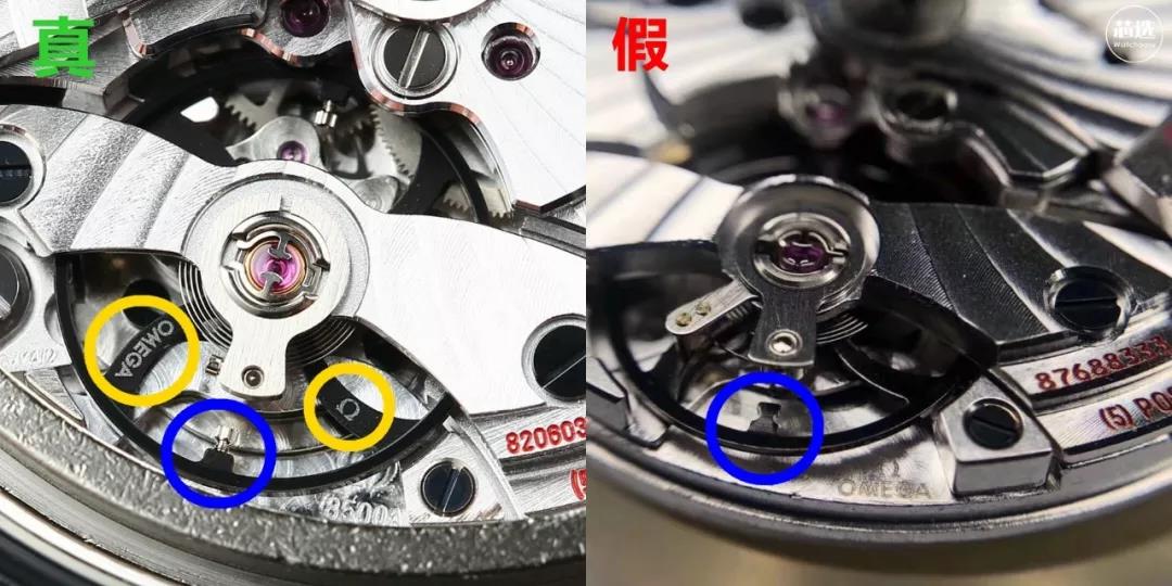 “魔高一尺道高一丈”,假表虽然在一步步地接近真表,但还是很难做到和真表完全一样。新一代假欧米茄同轴机芯已经做得很像,可至少和正品依旧有几十处的漏洞鉴定点。而这次为了方便普通表友,所以只挑了其中最容易学习和理解的三个。