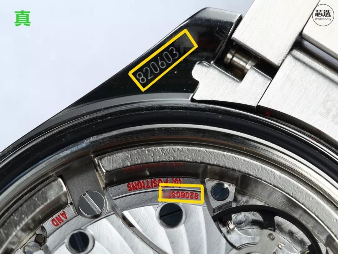 鉴别点三:真表机芯摆轮夹板上的编码 和 表壳上的编码是一致的。