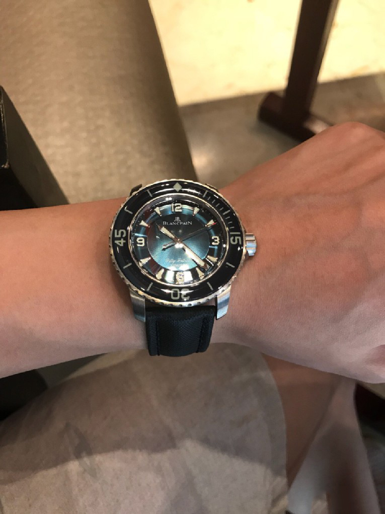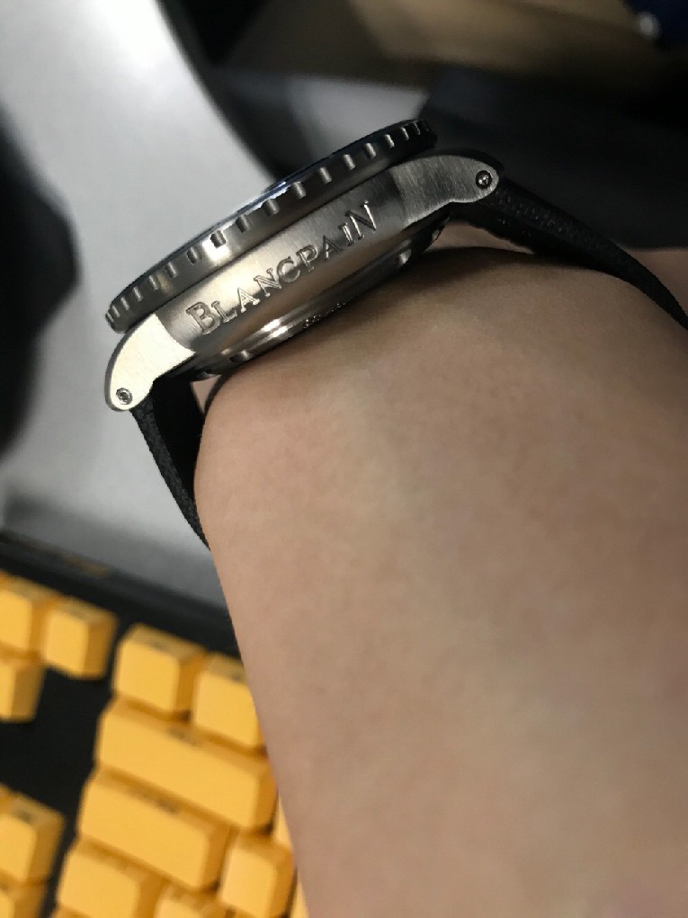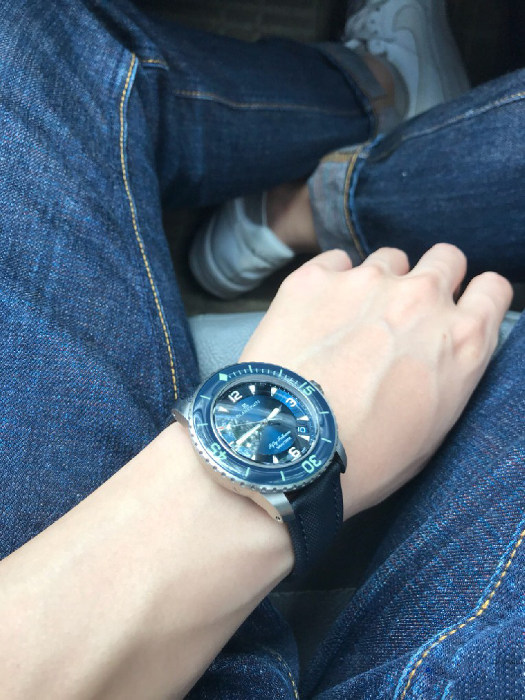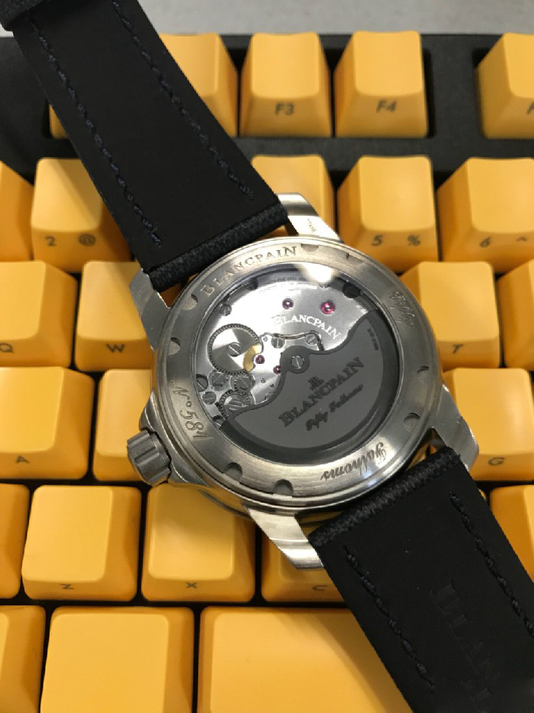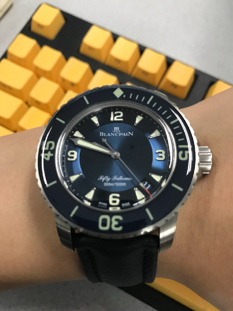 入手劳力士蓝黑圈之后,原以为可以一劳永逸,但日夜辗转总觉得缺了些什么。费尽思量,终于发现自己还是钟情于背透的。劳力士是好表,毫无疑问,但私以为机械表之区别于石英还是要有背透,感受、把玩和机械齿簧的交流,这是拉丝铁板无法带给我的。于是毅然决然入手宝珀五十噚5015蓝盘钛金属。