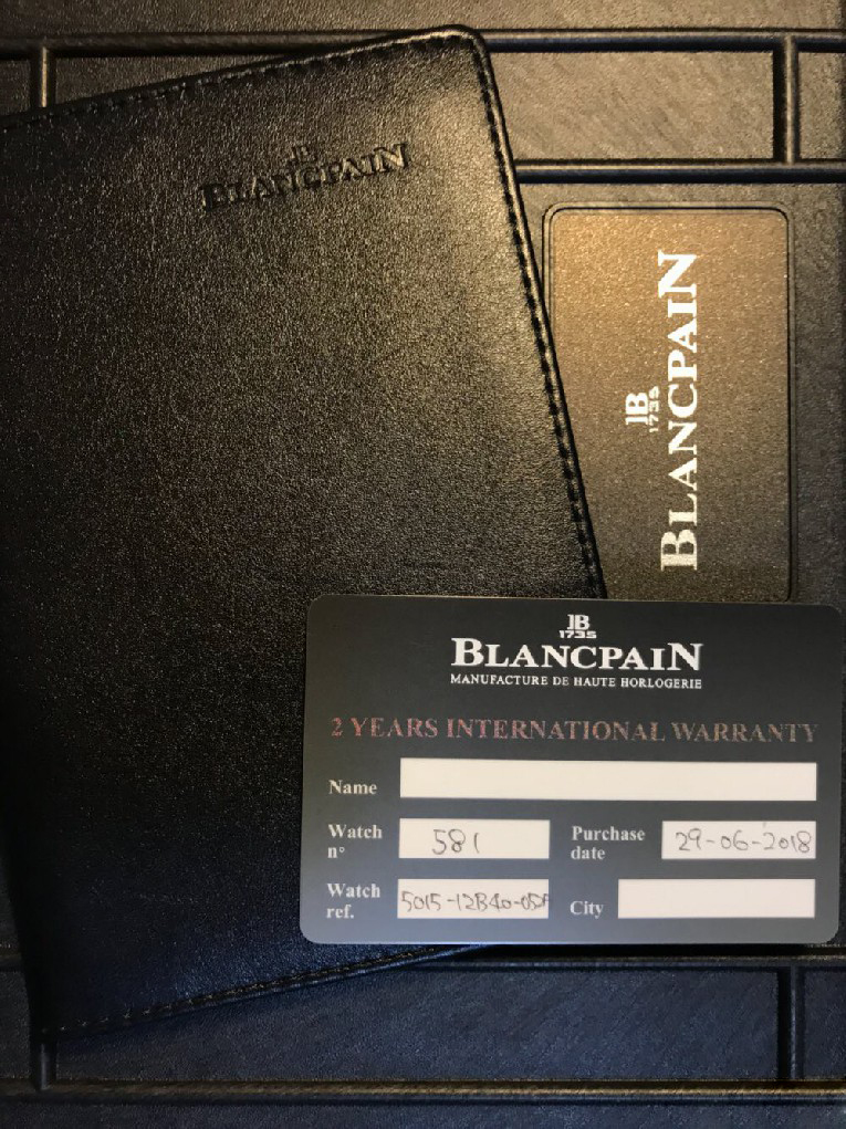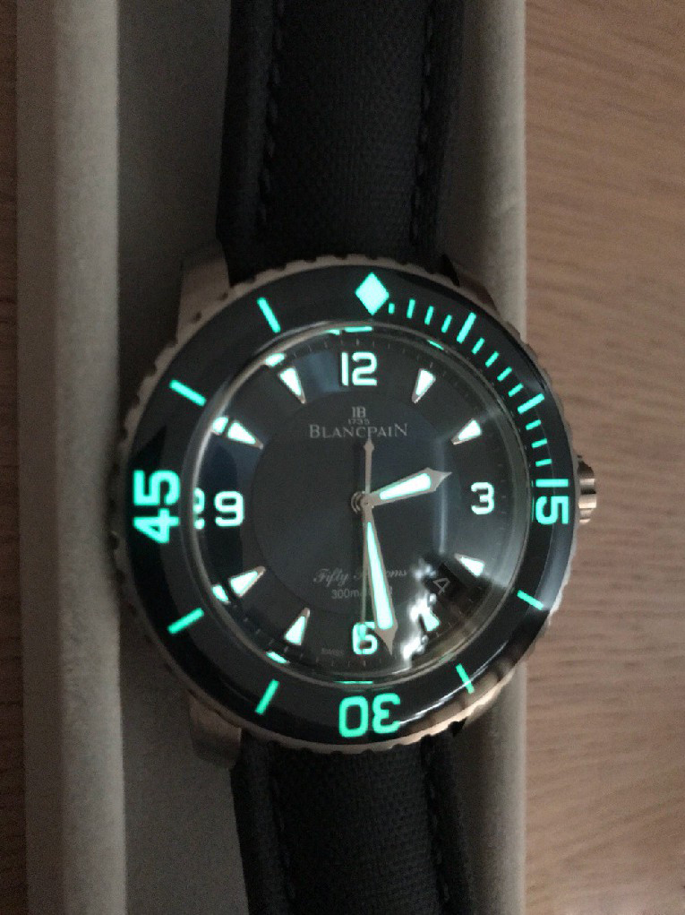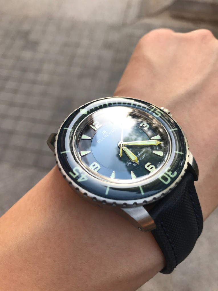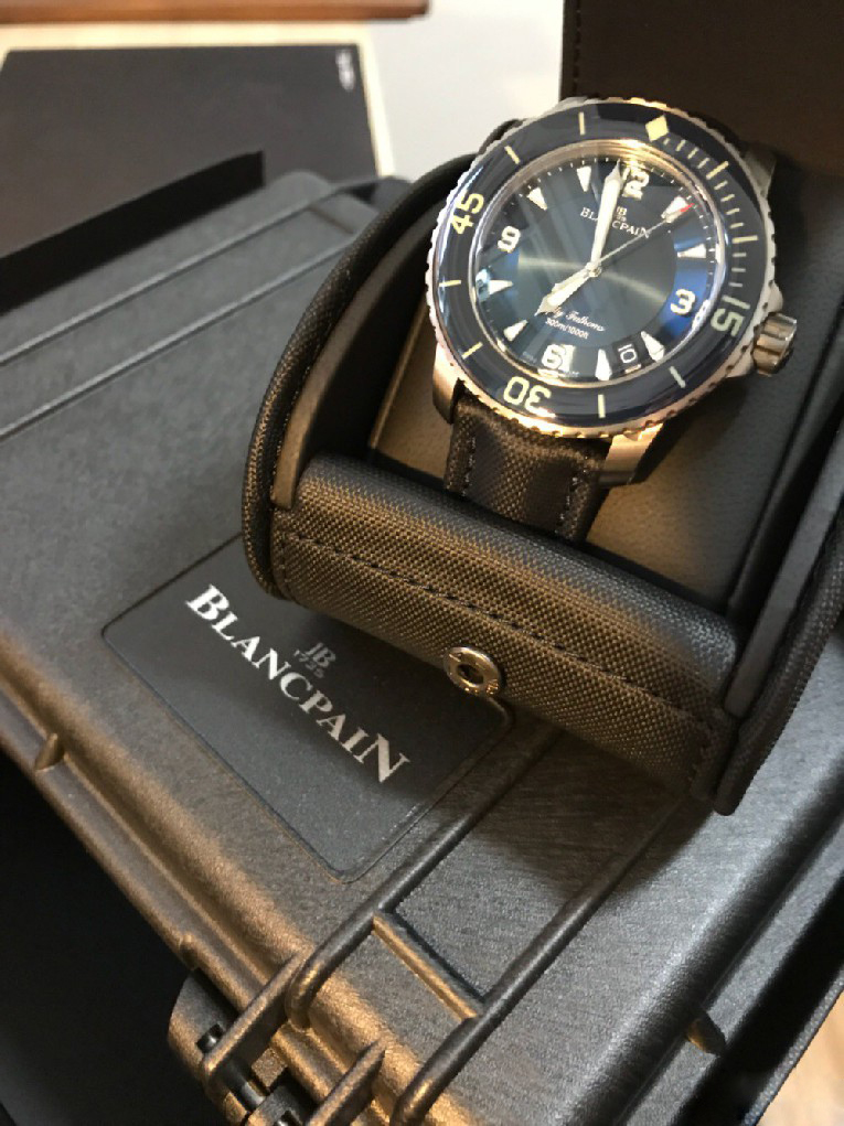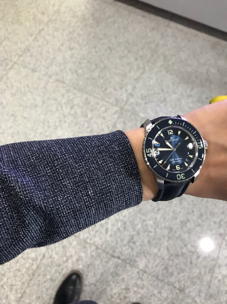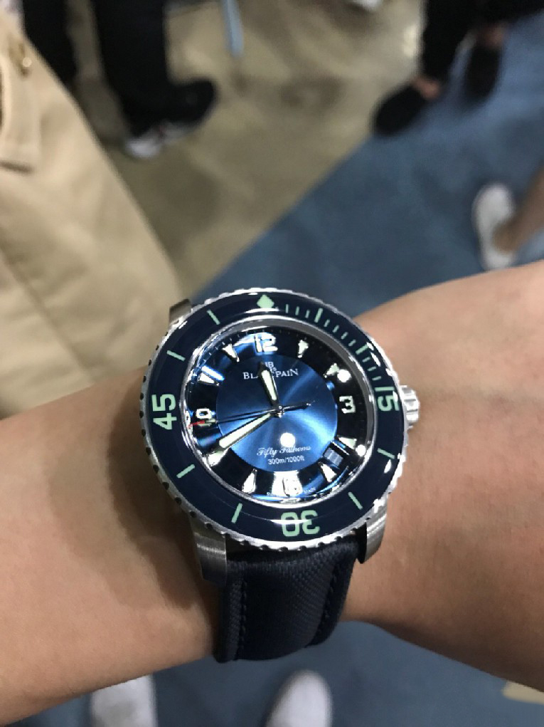 入手劳力士蓝黑圈之后,原以为可以一劳永逸,但日夜辗转总觉得缺了些什么。费尽思量,终于发现自己还是钟情于背透的。劳力士是好表,毫无疑问,但私以为机械表之区别于石英还是要有背透,感受、把玩和机械齿簧的交流,这是拉丝铁板无法带给我的。于是毅然决然入手宝珀五十噚5015蓝盘钛金属。