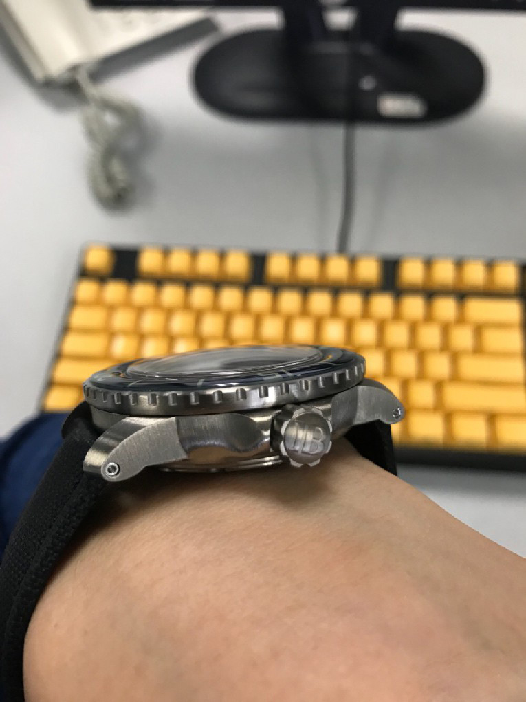 设计上个人还是喜欢经典的军款胜过深潜器,很多人的疑虑在于45毫米的巨大表径,但由于表耳较短实际并没有那么难以驾驭,我是16.5厘米的手腕,匀称身材,休闲和西装都还挺合适。表壳由五级钛合金制成,表面渗碳处理,耐磨耐刮花,细微划痕也可以自我修复。另外由于钛合金密度很低,整体也只有94克,非常轻便,几乎没有负担。