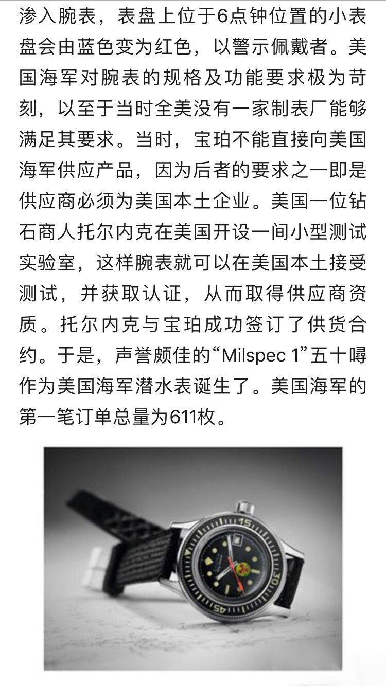 型号5015-12B40-052A,是最经典的五十噚军表造型,曾在法国蛙人潜水突击队和美国海豹突击队的手腕上服役。德国、西班牙、以色列、瑞典、挪威和芬兰等多国海军列装标配的五十噚,是切切实实经过实战考验的潜水表鼻祖,如今它躺在我的手腕上。