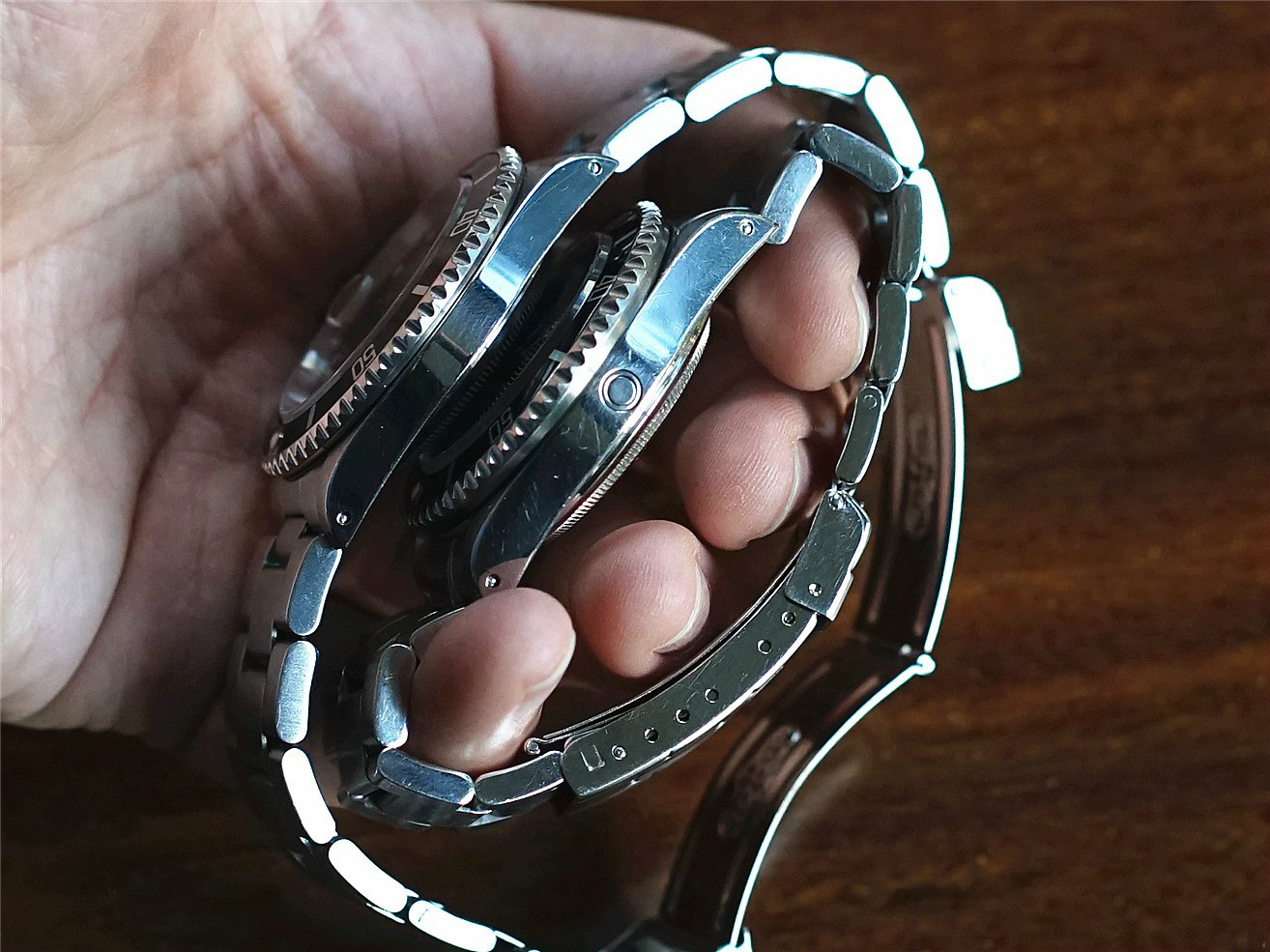 拿上手仔细对比,就会发现盘面的尺寸也是不一样的,反而是具有1220防水深度的海使看上去更小巧一些,老海使外圈实际表经是39MM,而水鬼是40MM,虽然仅仅相差一毫米的盘面设计,比例更加顺眼和谐