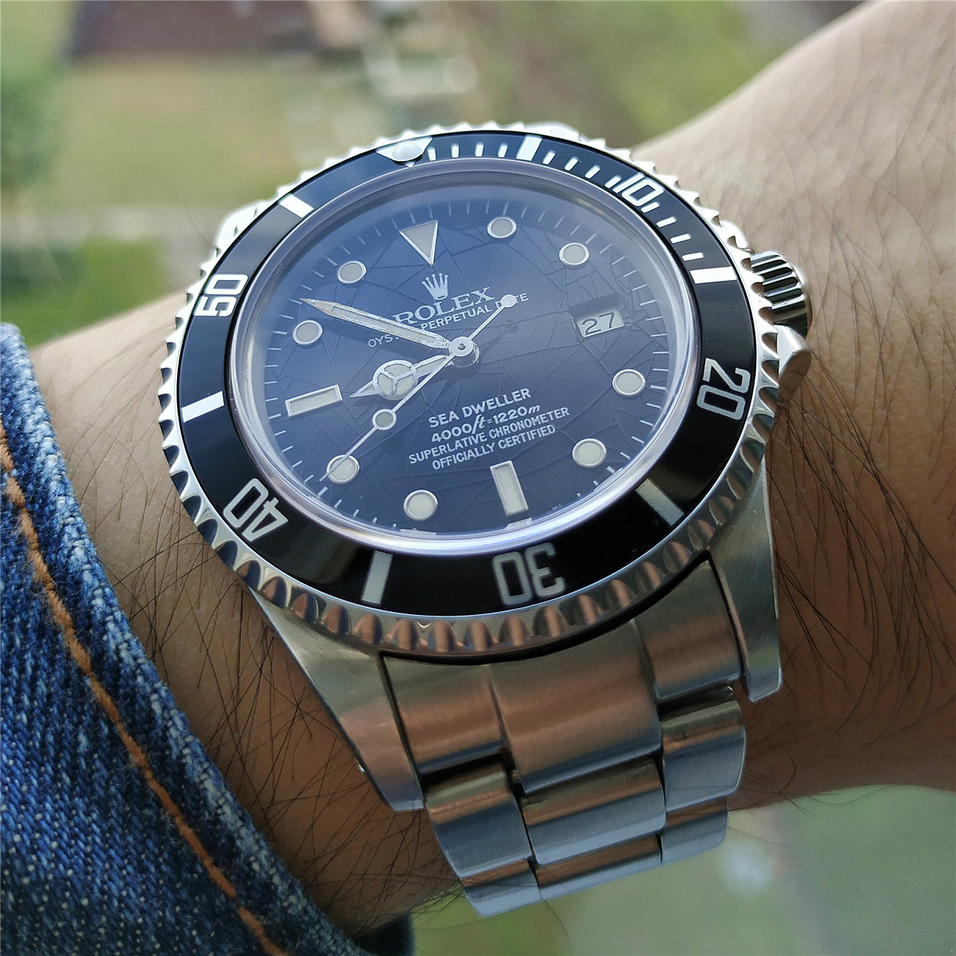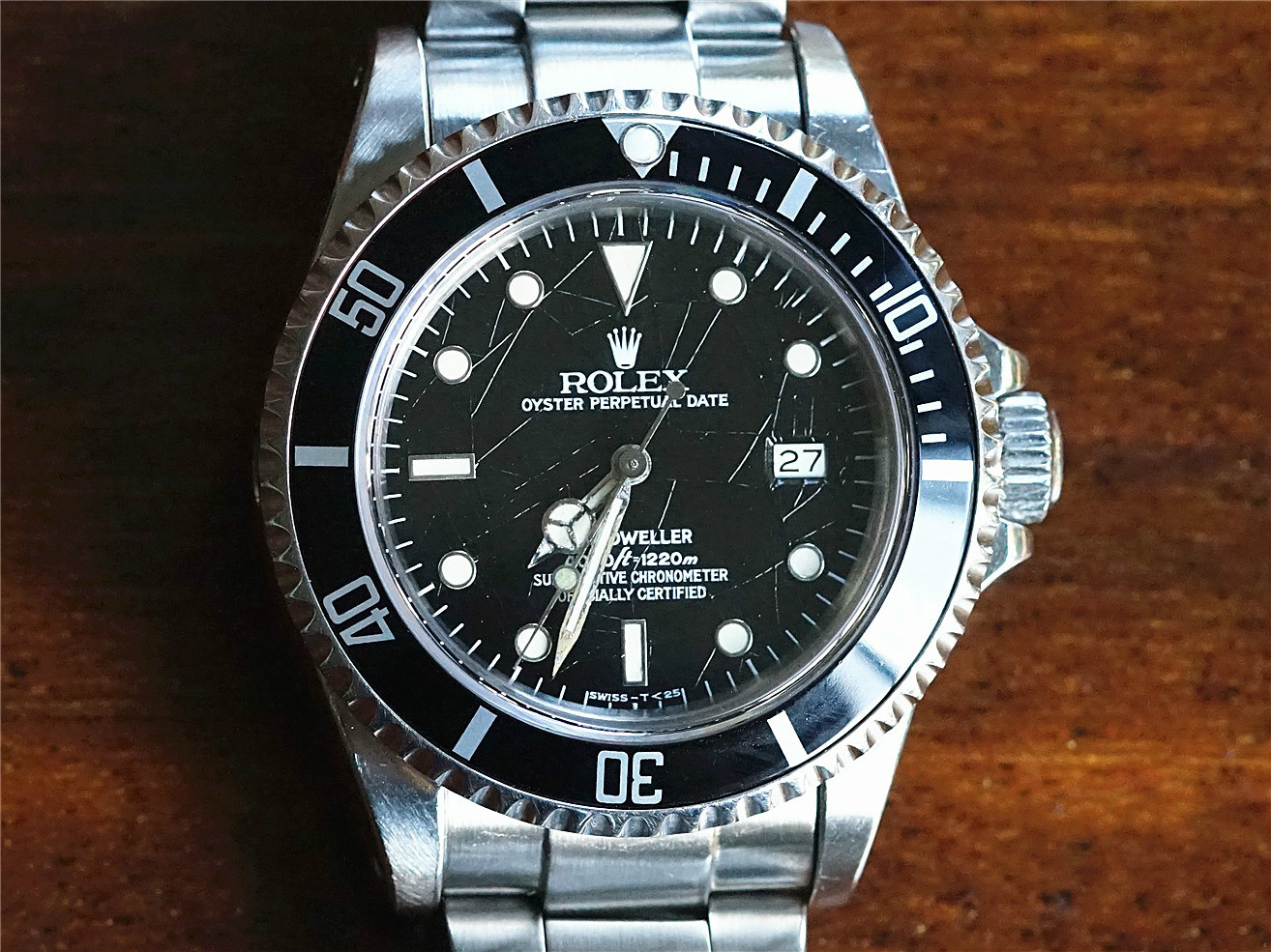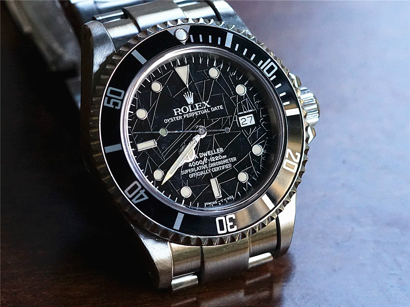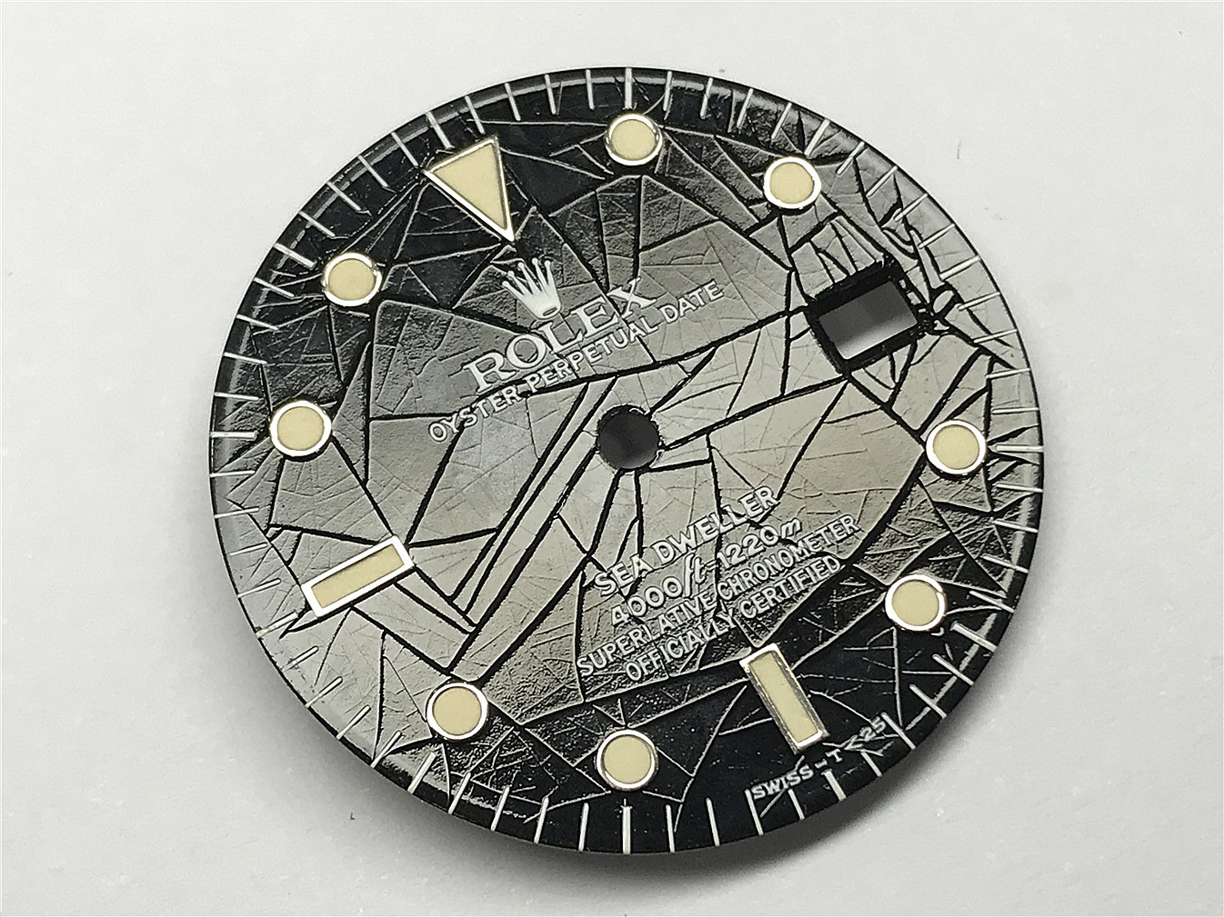 可以看到盘面非常特殊,缘由负责盘面保护漆(最表面的清漆)出现重大的质量问题,时间一久老化会出现裂痕,而这种特殊盘面被劳迷们称作“Spider Web Dial”--“蜘蛛网盘面”