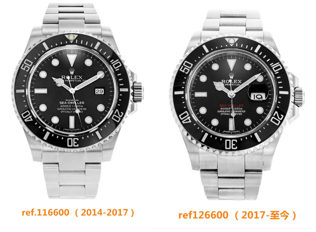 2017年发布搭载新3235机芯的Ref 126600 第五代海使,表经改为43MM,盘面采用一行红色SEA-DWELLER做海使50周年纪念