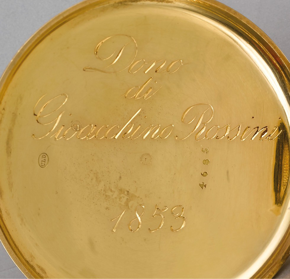 这是一枚超薄怀表,制于1853,来自博特公司。此时伟大的制表师博特先生已仙逝,但产品质量依然维持着高级品质,18K黄金,简洁优美,防尘盖上刻着“Dono di Giacchino Rossini 1853”,是罗西尼赠与一位银行家朋友的礼物。