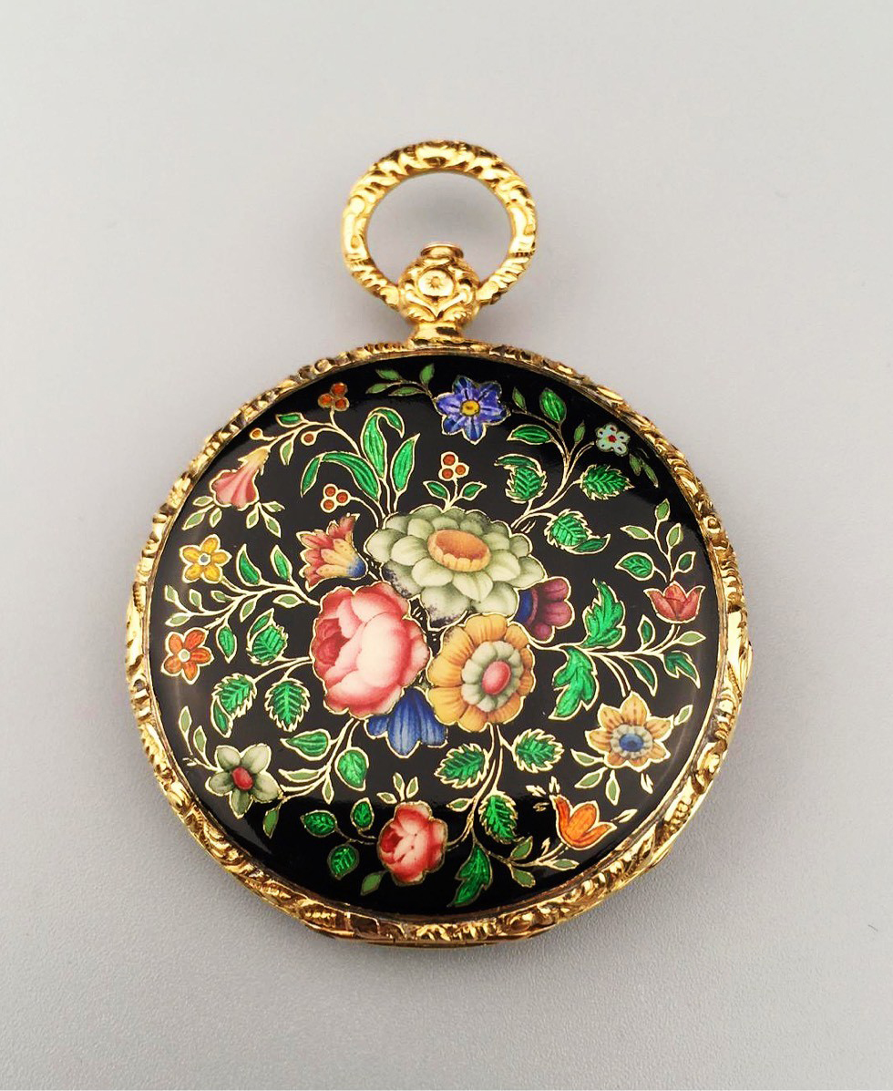 博特在日内瓦首创建立了史上最综合全面的制表厂,有180名专职工匠,120名外包工匠。博特是超薄怀表最早的制作人之一。芝柏历史的第一页,就是从博特开始。前些年,在瑞士汝拉山谷钟表藏家朋友那里获得一枚1830年代的超薄博特怀表,黑底珐琅百花,是典型的博特作品。