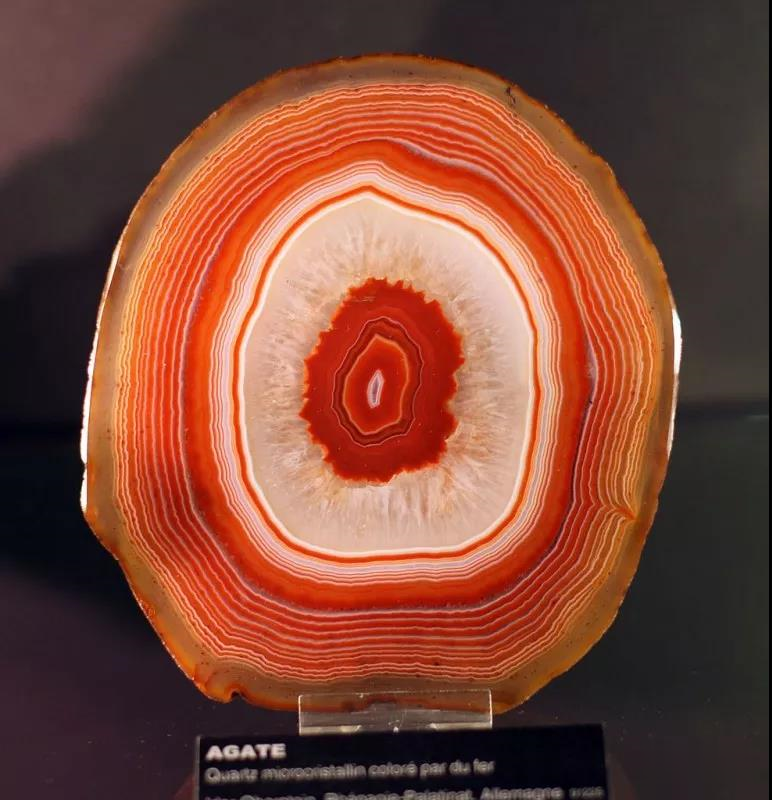 大部分的玛瑙都以喷出岩或远古熔岩中的结核的形式存在,由最初的熔融物里挥发成分所形成的空腔被硅酸盐成分沿壁一层一层凝结填充所形成。玛瑙也会填充喷出岩或蚀变岩被花岗岩侵入所产生的空腔。这种玛瑙被横向切开时,会显现一系列通常极细的平行线状纹理,产生条带状色彩的外观。-61d5fa70-938e-4eae-a886-f282b5bc747b.jpg)