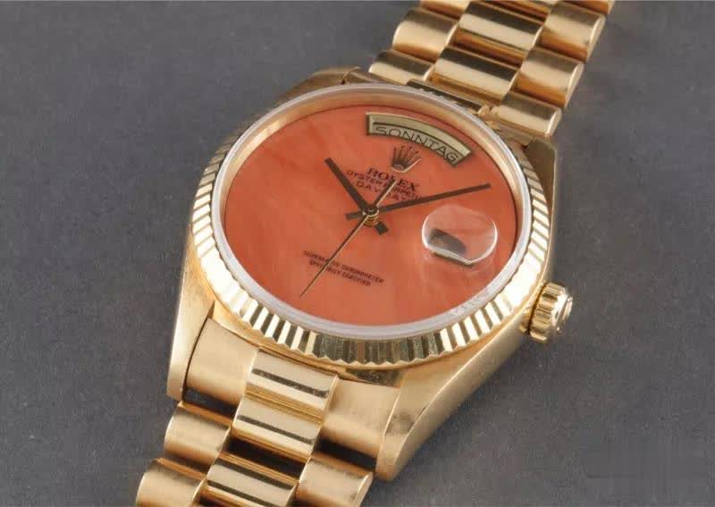 这个Day-Date Ref.18038有一种特殊类型的珊瑚表盘,称为“天使之皮”。2015年Philips拍卖出82500瑞郎。