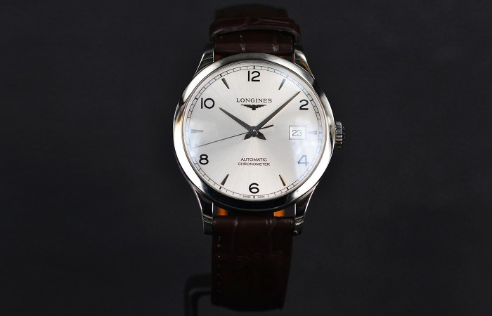 银白色日辉纹盘面,中央大三针与阿拉伯数字、三角立体时标以及外圈轨道盘相辉映,令盘面布局一目了然,时间指示清晰直观。3时标位置设有日历显示窗口,12时标下方,设有大写的浪琴英文标识以及经典的“沙漏飞翼”LOGO,赋予腕表简洁美感。