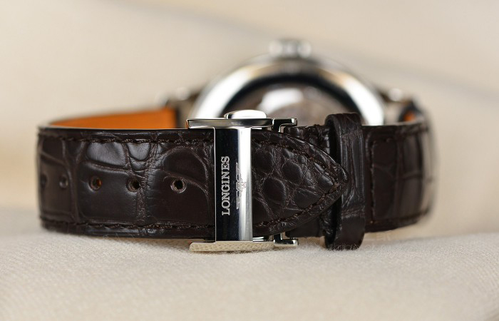 此款腕表搭配深棕色鳄鱼皮表带,自然、大方的纹饰以及整齐的棕线封边,令这款腕表在外观上成熟、大气,给人留下深刻印象。搭配一个精钢折叠表扣,简单地触动两旁的按钮就可打开表带,穿戴便利。