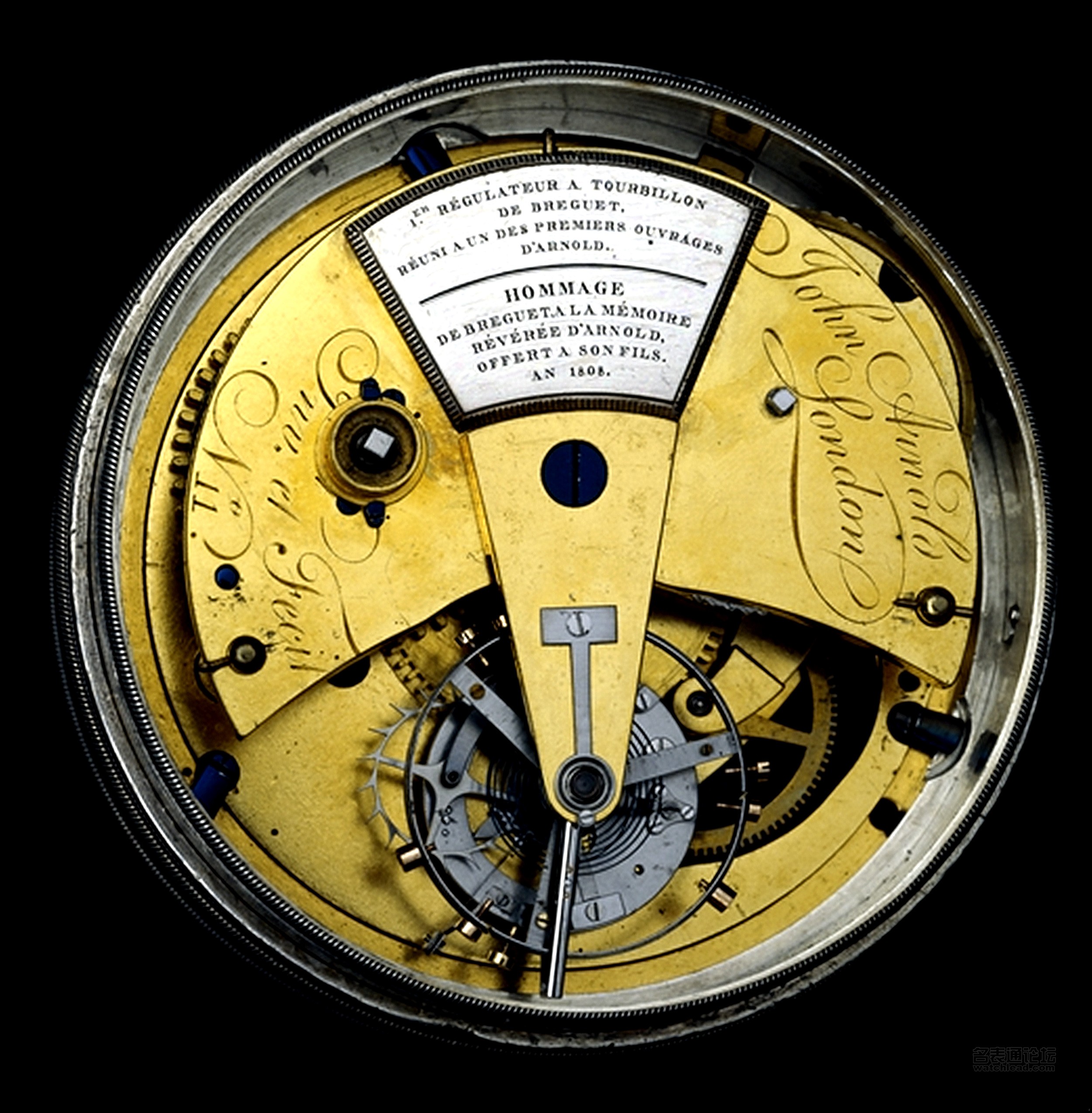 有学者认为,陀飞轮的技术理念,就是在两位大师交往和交流之中由约翰·阿诺德提出来的,可遗憾的是约翰·阿诺德到他1799年去世前都没有完成自己的心愿,而宝玑却在1795左右成功地发明了陀飞轮。当然,史料记载,宝玑当时也承认约翰·阿诺德是最早研究陀飞轮之人,为此宝玑在他去世以后,把自己第一块陀飞轮机芯,安装在了约翰·阿诺德早前的一块天文怀表的表壳内,送给了约翰·阿诺德的儿子——约翰·罗杰(John Roger),并且在表壳上刻下一段纪念性的文字:“宝玑制作的第一个陀飞轮计时器装入阿诺德的作品里,以表示宝玑的崇敬和纪念之情,并交给了他儿子AD,1808年”。这是一件怀表历史上极其重要的珍品,现由伦敦大英博物馆收藏。