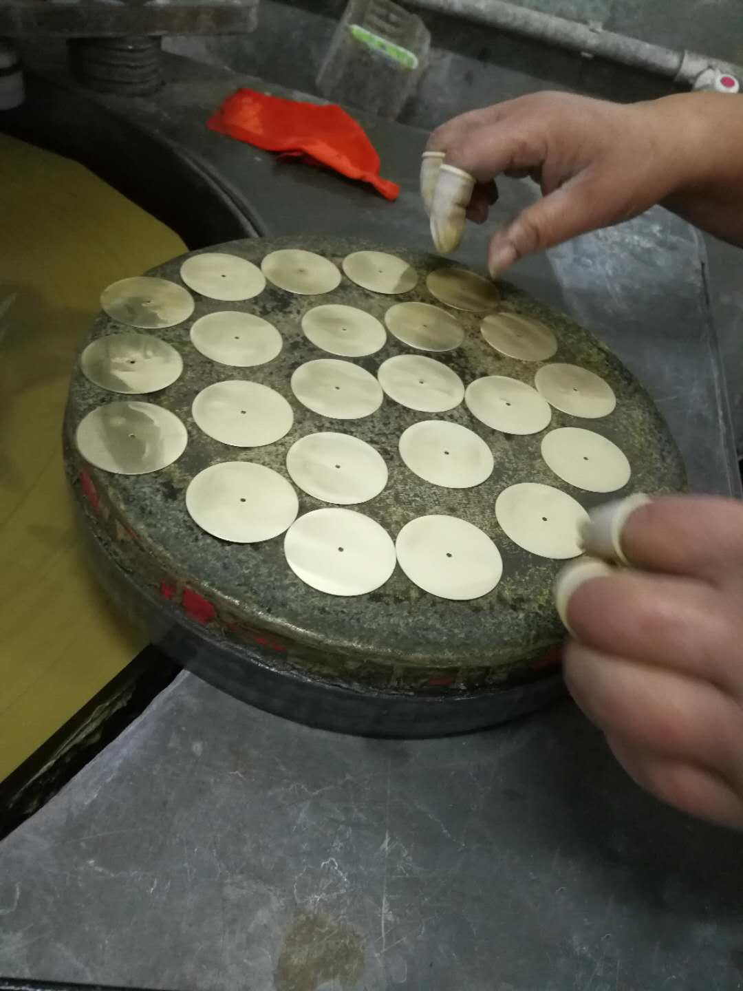 冲压好外形再冲孔,中孔、字钉孔和logo孔,打好孔要磨批锋倒角
