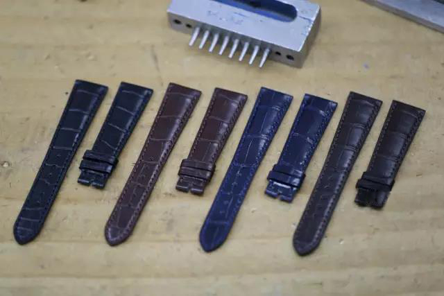 为了让一根表带的两个部分的视觉效果更佳,好的表带生产商一定会在开料的时候“比对花纹”,同时尽可能避开鳄鱼在生长期留下的疤痕。有时候在好几张鳄鱼皮中才能凑出一根鳄鱼表带所需的花纹匹配皮料。