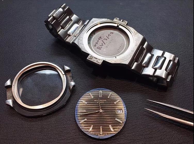 Hofmann拆了一块百达翡丽Ref.3700解开了其中的奥秘,鹦鹉螺的表盘原本是圆形的,因为表壳设计的缘故会遮住一部分。所以晒过太阳的中间部分已经变成了棕黄色,而几乎没有看见过紫外线的部分则最大程度保留了当年的蓝黑色。所以说,Tropical Dial热带面的关键在于紫外线照射量。