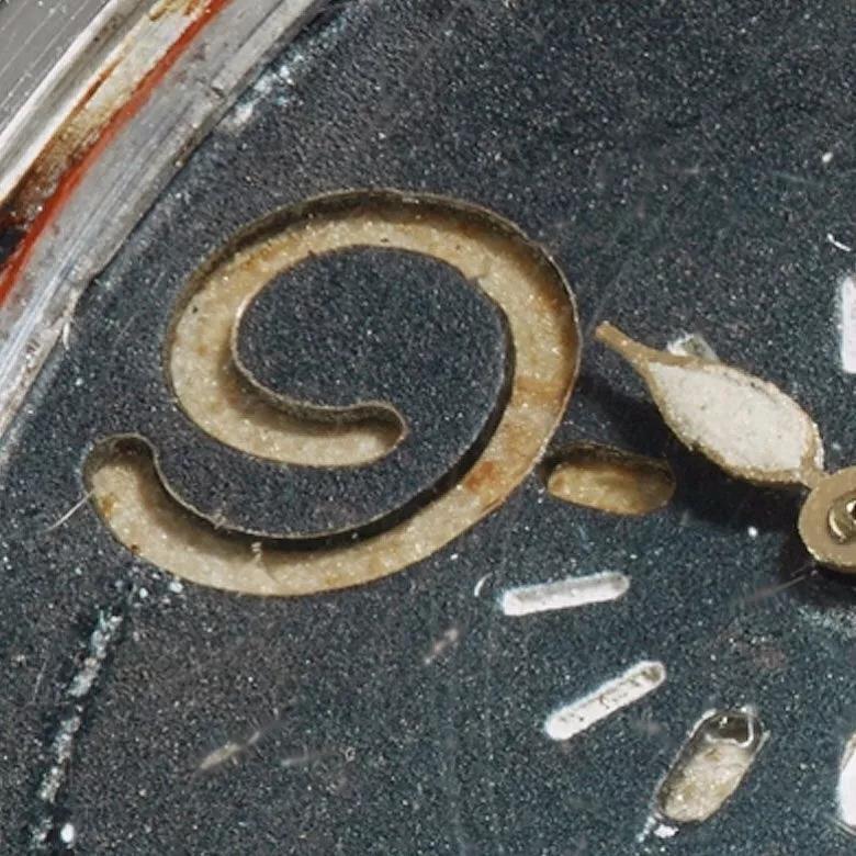 打个比喻,前面是凸版印刷,后面是凹版印刷。在特定角度下,用高倍的放大镜可以清楚地发现,Gilt Dial的金色字体部分是低于表盘的黑色部分,乃凹下去的。