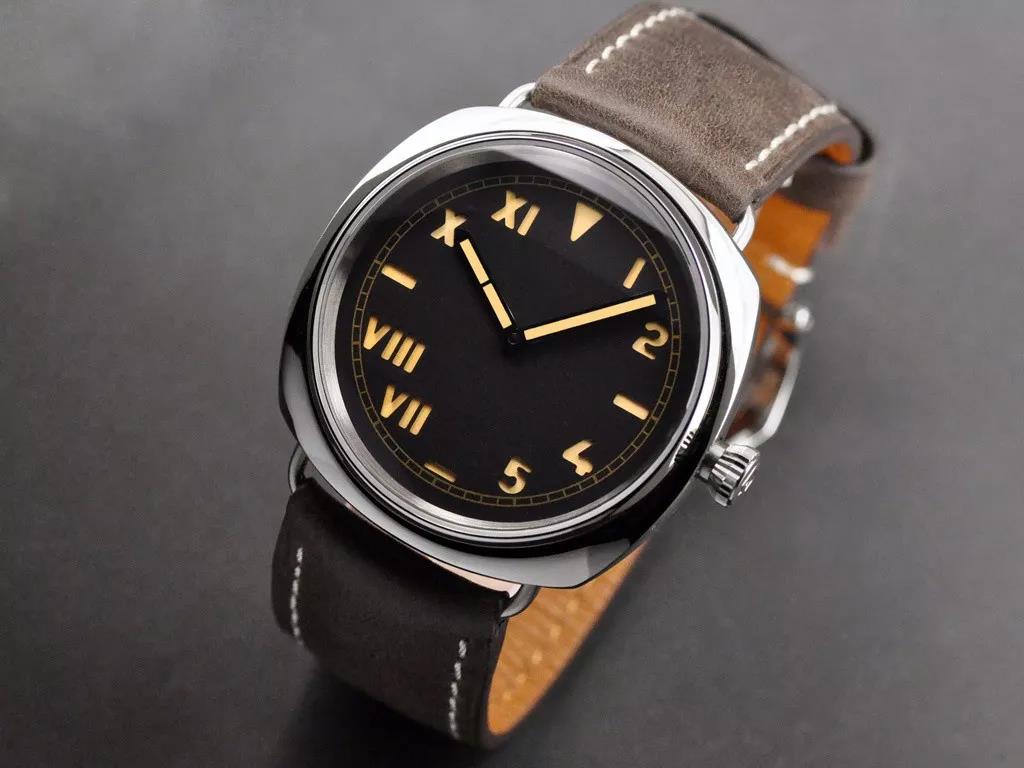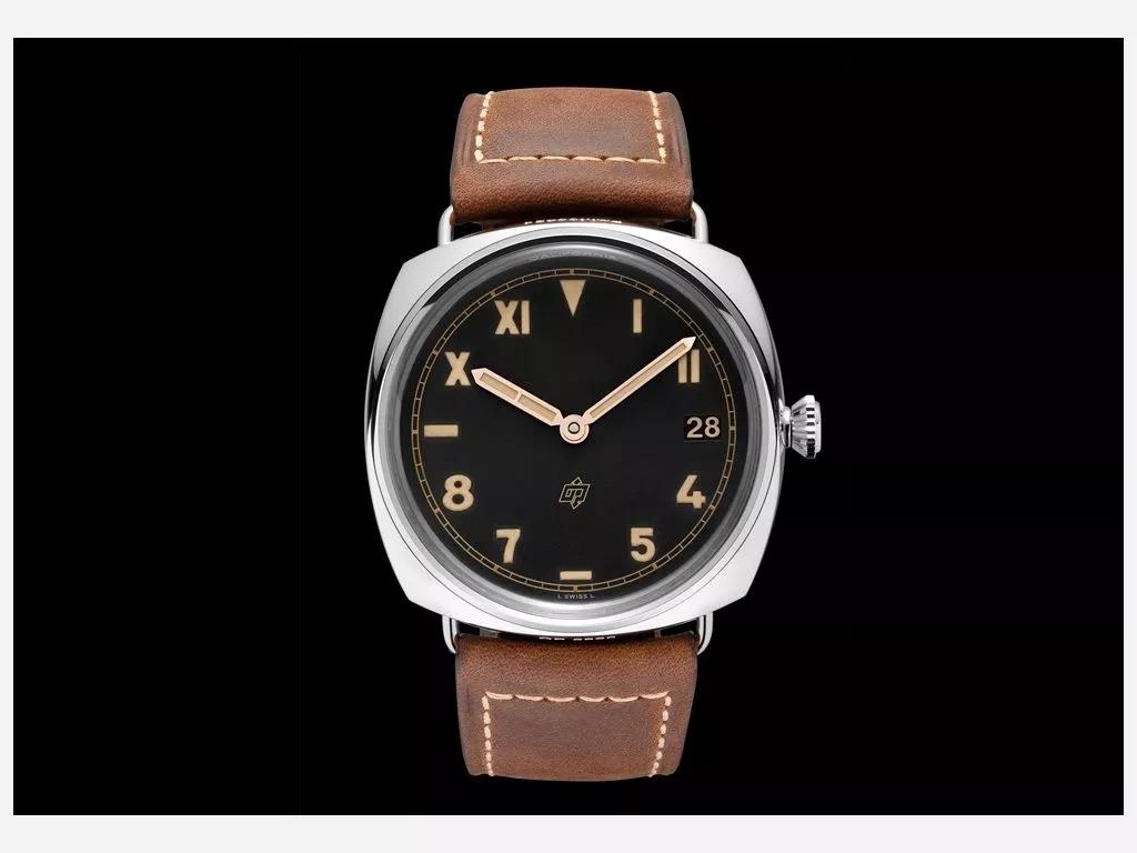 沛纳海有个很出名的手表元素叫“三明治”面,其和常见表盘不同的地方在于它的夜光粉并不是直接涂在表盘上,而是夹在两张金属片中间。透过上面镂空的地方来显示刻度、数字。这样的设计有助于利用更多的夜光粉,提高夜间亮度。
