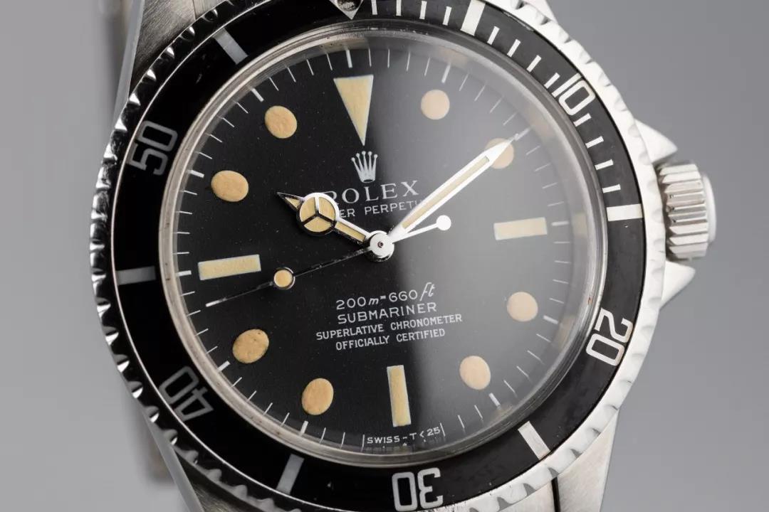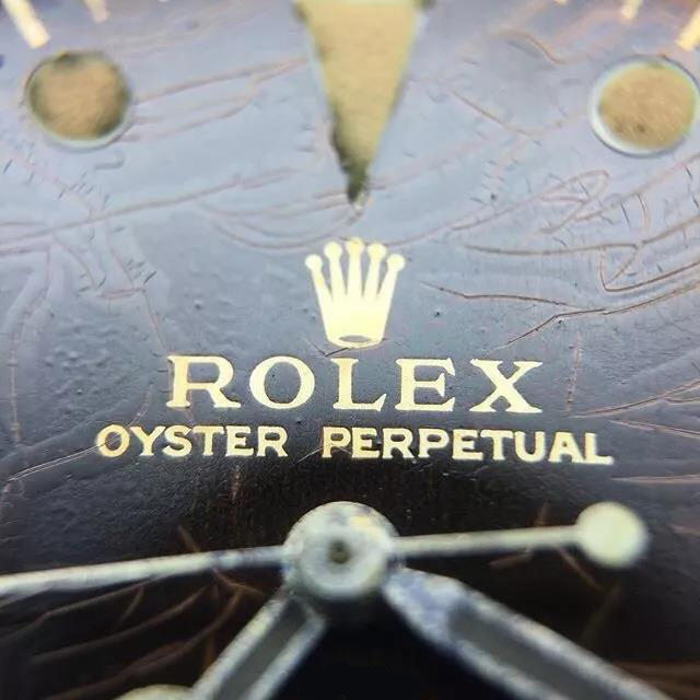 常见的手表都是印刷是在底漆上面移印字体,比如上面这块劳力士Ref.5512,它的表盘基底是金属铜,然后刷上了一层黑色的底漆,最后把白色的字体、刻度、Logo给加印上去。