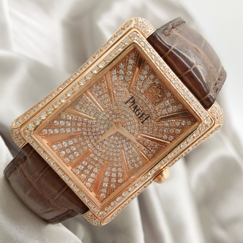 产品简介:PIAGET/伯爵BLACK -TIE系列G0A32121升级G0A33076,表径36x46毫米,18k玫瑰金,自动机械男表,银灰表盘,动力储备44小时,后镶满天星,参考公价645000,二手95新单表,整表95克左右,相当于买黄金送表!