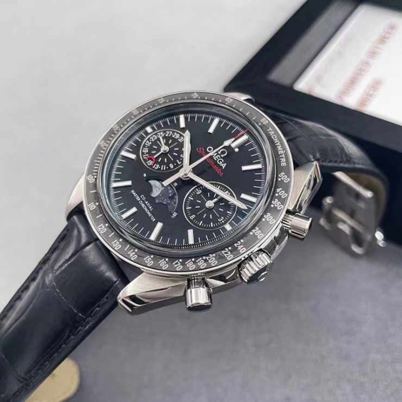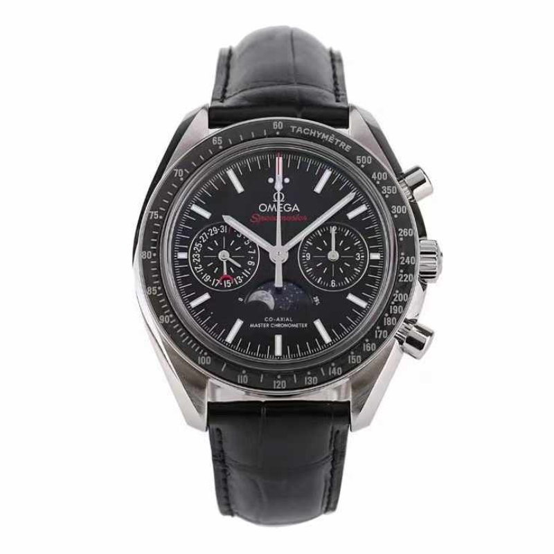 产品简介:OMEGA/欧米茄超霸系列304.33.44.52.01.001,表径44.25毫米,精钢,自动机械男表,黑色表盘,动力储备60小时,日期显示,月相,计时,防磁
